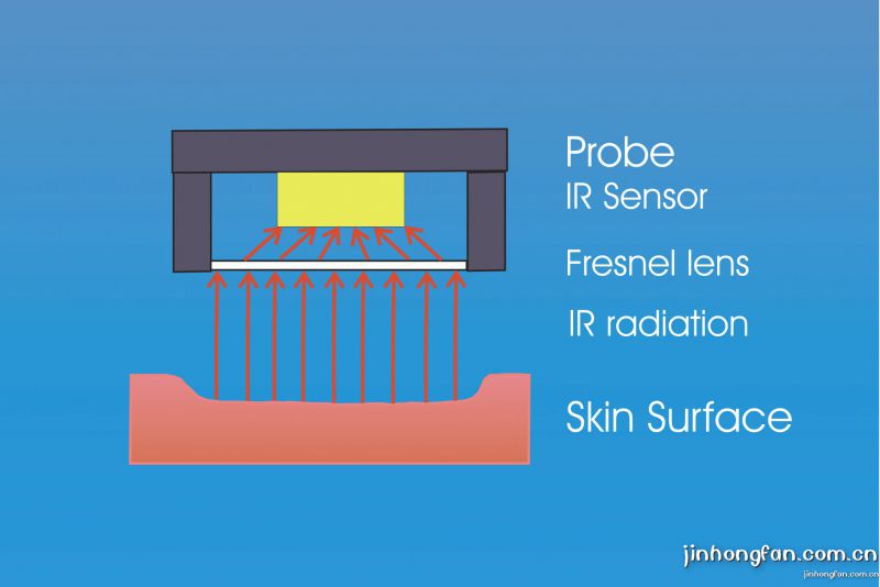 探頭通過傳感器接收皮膚表面發出的紅外線來測試皮膚表面的溫度,這是一種皮膚 表面溫度的非接觸式測量方法。可以用這種方法來測定皮膚表面在使用化妝品之后的微循環變化。